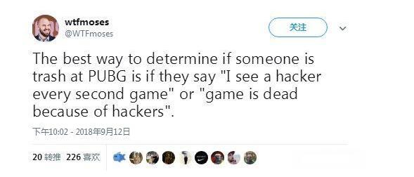 众所周知,绝地求生这款游戏一直被外挂所干扰着,不仅仅是普通玩家苦不堪言,就连职业选手也备受“摧残”。在今年开年那段时间外挂更是猖獗到演都不演,各种腰射、自瞄、子弹追踪应有尽有,官方在一个月的时间内就封禁了160万个外挂账号。在这种恶劣的游戏环境之下,许多普通玩家都变得十分敏感,在游戏遇到自己难以理解的技术或者神经枪往往会以“这人是外挂”而下定义。近日一知名绝地求生解说wtfmoses就在自己的推特中这样说道: