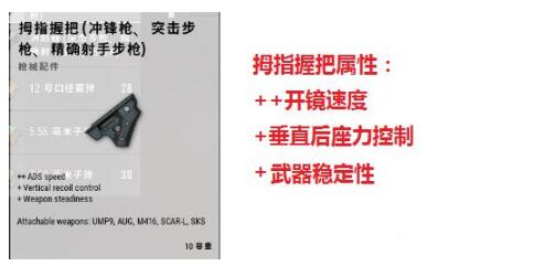 2.M416用于100米范围内的扫射和基础镜点射的玩家:强烈推荐“拇指握把”:这个握把,极大的增加了开镜速度,且在垂直后座力控制和武器稳定性方面都有大幅增加,在步枪用于多情况作战的情况下,可以有效弥补M416在中距离由于平行后座力导致的枪口左右跳动。