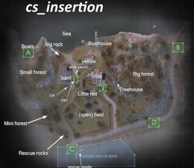 ÕâÕŵØÍ¼Ëä˵ÊôÓÚÈËÖÊÕü¾Èģʽ£¬µ«ÆäÔÚ¿ª¾ÖµÄ¸´»î·½Ê½È´ºÍÆäËû´«Í³ÈËÖʵØÍ¼ÂÔÏÔ²»Í¬¡£CT·½Í¨¹ýËÄÖÖÔËÊ乤¾ßÀ´µ½×÷Õ½µØÍ¼ÉÏ£¬°´ÕÕ³Ë×øÔËÊ乤¾ßµÄ²»Í¬£¬Íæ¼ÒËù¸´»îÔÚµØÍ¼ÉϵĵãλҲ·ÖΪABCDËĸöÇøÓò£¬ÕâÐ©ÇøÓòµ½µØÍ¼ÖÐÑëµÄ·³ÌÒ²Óв»Í¬£¬ABCÇøÓò·³Ì½Ï½ü£¬¶øDÇøÓò×îÔ¶¡£¶øT·½ÔÚ¿ª¾Ö¿ÉÒÔÑ¡Ôñ¸´»îÔÚµØÍ¼ÖÐÑëµÄ¹È²Ö»òÕßÊDZðÊûÍ⣨ͼÖÐ1¡¢2µã룩£¬µØÍ¼ÖеÄÈËÖÊ·Ö±ðλÓÚµØÍ¼ÖÐÑëµÄÈý¶°·¿×ÓÖУ¬T·½Òª×öµÄ¾ÍÊÇ×èÖ¹CTЯ´øÈËÖʵÉÜÇøÓò£¨Ö±Éý»úÓª¾ÈÇøÓò£©¡£ÓÉË«·½ÕóÓª¸´»îµãÉ趨À´¿´£¬ÕâÕŵØÍ¼µÄ´´×÷ÕßÏë±ØÊDzο¼ÁË"²ÊºçÁùºÅ£ºÎ§¹¥"¾º¼¼Ä£Ê½µÄ¸´»îµãÑ¡Ôñģʽ¡£